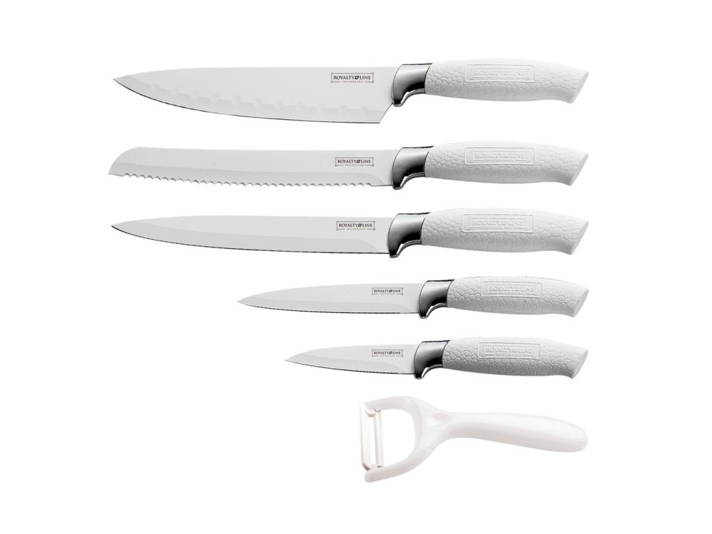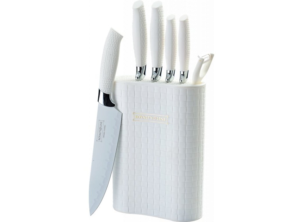 Sada 5 nožů, škrabky a stojanu Royalty Line RL-6MSTW - bílá