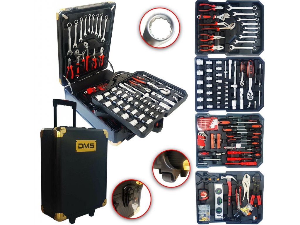 Hliníkový kufr od značky DMS Germany, který obsahuje sadu velkého množství dílenského náčiní. Teď můžete opravovat jako naprostý profesionál. Kufr disponuje praktickými kolečky a teleskopickým úchytem, takže přeprava bude jednoduchá. Celkem 4 plná nástrojová plata nářadí z chrom-vanadiové oceli. Sada obsahuje celou řadu kleští, šroubováků, klíčů, kladivo, vodováhu, imbus klíče, bity, základní spojovací materiál a celou řadu dalšího nářadí, které je vhodné pro použití jak doma, v garáži, tak i na cestách.